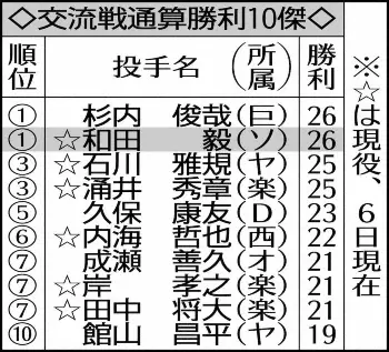 ソフトバンクの和田毅投手(40)が阪神戦に先発し、7回4安打無失点の好投で今季4勝目を挙げた。交流戦通算26勝は元同僚の杉内俊哉(現巨人投手コーチ)に並ぶ歴代1位となった。