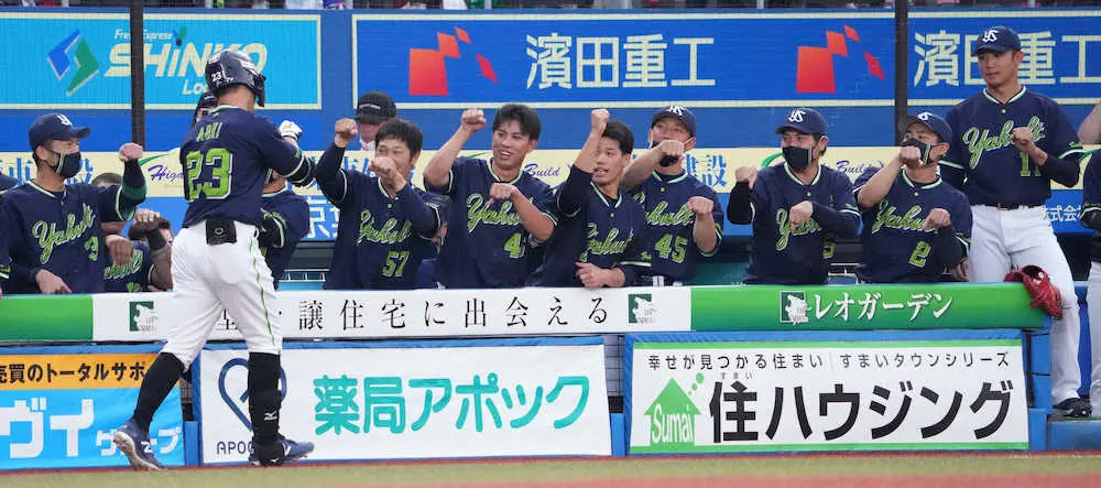 <ロ・ヤ1>初回、先頭打者本塁打の塩見に続き青木も右中間に運びベンチに迎えられる(撮影・長久保 豊)