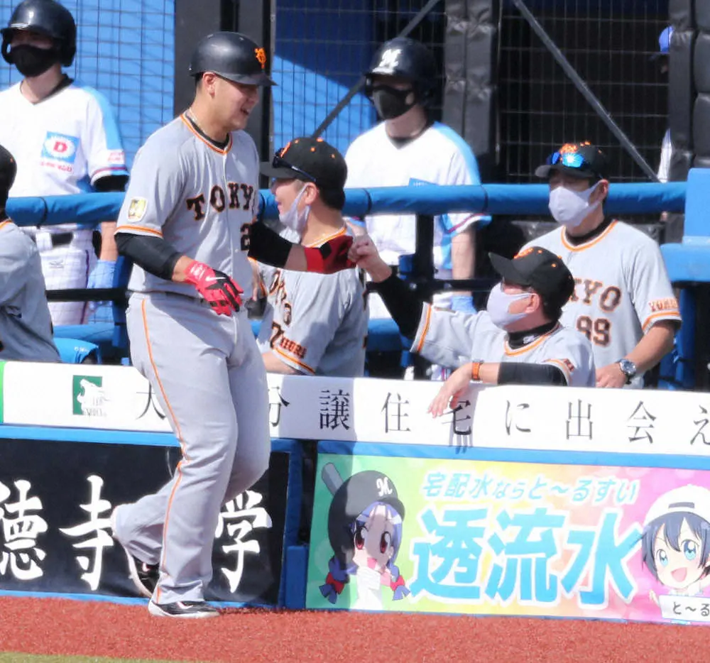 <ロ・巨>3回無死一、三塁、3点本塁打を放ち、原監督(右から2人目)らに迎えられる岡本和(左)(撮影・木村 揚輔)