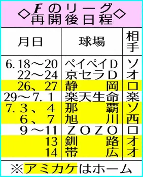 ≪札幌Dはサッカー会場・日本ハムは移動距離8800キロ≫パ・リーグでは日本ハムも本拠地・札幌ドームが東京五輪サッカー会場となり使用できなくなる。6、7月のホームゲームは4カード予定されているが静岡、那覇、旭川、釧路、帯広で開催。ビジターも含めて日本中を飛び回ることになる。1カ月間の移動距離は約8800キロ。地方球場に屋根はなく梅雨時の天候も気になるところ。首位から10.5ゲーム差の最下位と苦戦している日本ハムには試練の1カ月となりそうだ。