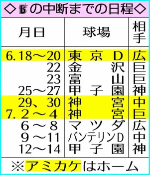 ≪66年ぶりに神宮でVS巨人≫DeNAは東京ドームの他に6月29、30日の中日戦と7月2~4日の巨人戦を神宮で行う。DeNAと巨人が神宮で対戦するのは大洋時代の55年11月23日のダブルヘッダー以来66年ぶりだ。また、ヤクルトも7月中旬から9月上旬まで神宮球場が使用できなくなるため、6試合が東京ドームでのホームゲームとなる。
