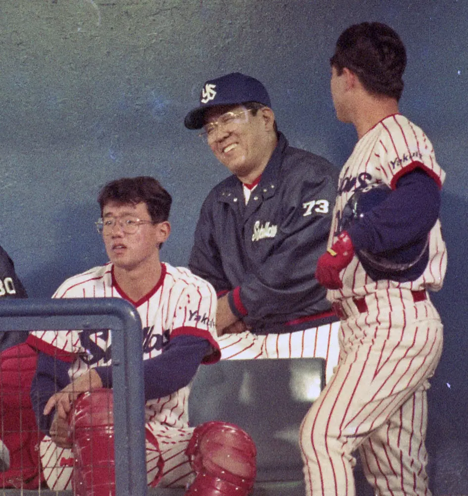 1991年、ベンチで笑顔を見せる野村克也監督(中)と、古田敦也氏(左)