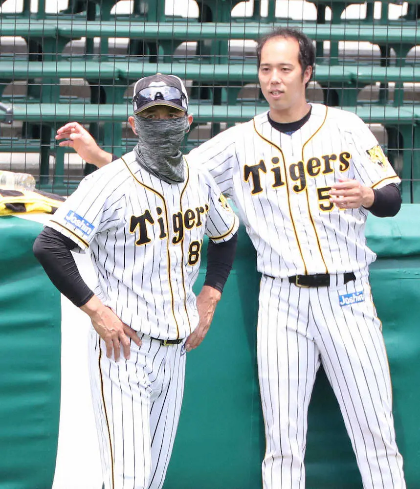青柳(右)と話す矢野監督(撮影・坂田 高浩)