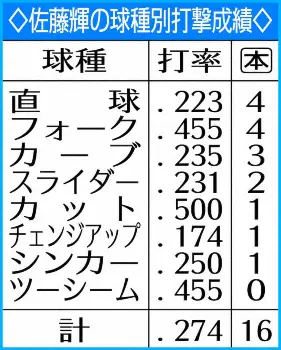 フルスイングを貫き追い込まれても「合わせるのは嫌。しっかり振って打ちたい」と強いスイングにこだわる新人。最大の長所だが「もろ刃の剣」。球速差でタイミングを外す「奥行き」が効果的だ。5月16日の7回、野上は3球連続で外角低めへ。初球143キロ直球、3球目111キロカーブで空振り三振。打率・417の得意コースだが、球速差32キロで3球三振だった。球速の遅いカーブは打率・235、スライダーは同・231で特に球速の遅い大きなスライダーに苦労している。また、左投手のスライダーは打率・208。先発のメルセデス、高橋、救援の高梨、中川ら左腕の腕の見せどころだ。
