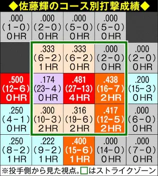 内角中央のベルト付近は打率・174、0本塁打。ストライクゾーン9分割のうち、外角高めと内角ベルト付近のみ打率3割を下回る。好例が5月15日の5回。サンチェスは初球、内角中央に151キロ直球を投じてファウル、2球目も同コースの148キロ直球で左飛に抑えた。一方でその内角中央のボールゾーンは打率5割。ピンポイントの制球力が鍵となる。