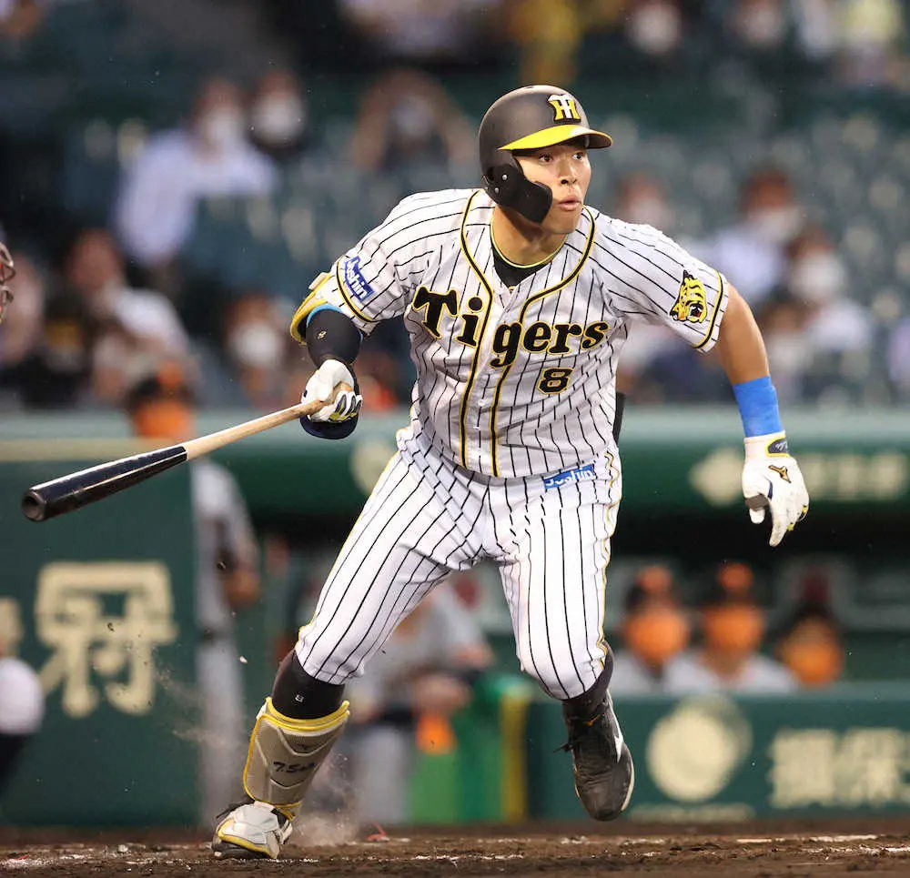 <神・巨(10)>2回無死、佐藤輝は右翼線二塁打を放つ(撮影・北條 貴史)