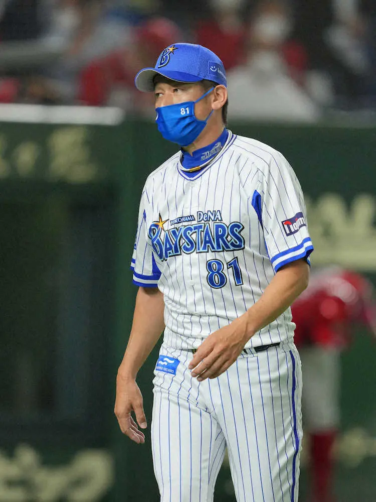 <D・広>3回、浜口の交代を告げベンチへ戻る三浦監督(撮影・島崎忠彦)