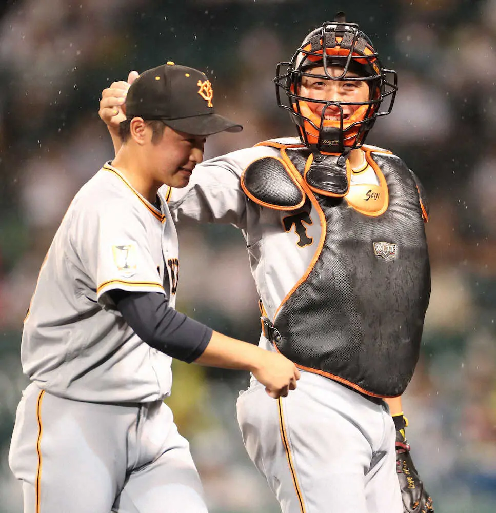 <神・巨(10)> 8回、しっかり抑えた戸田(左)を迎える小林(撮影・平嶋 理子)