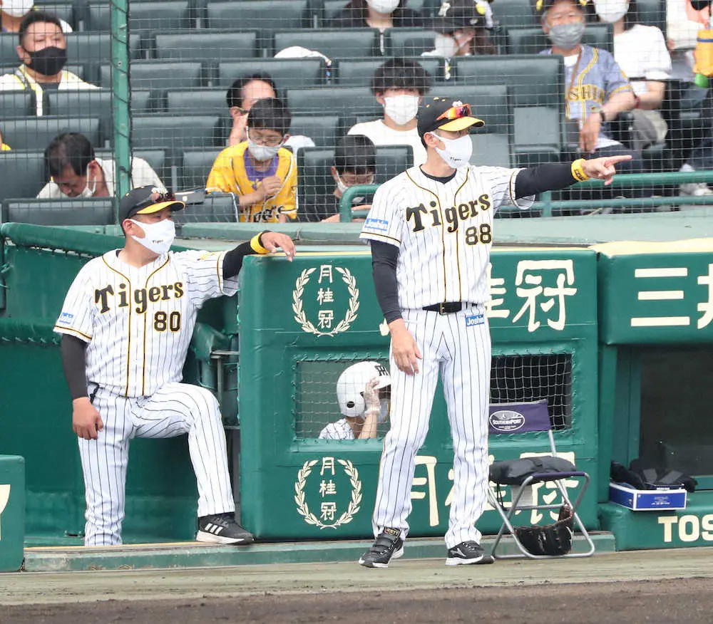 <神・巨(12)>7回2死一、二塁、打者・中野に代え、代打・北條を送り出す矢野監督(右)(撮影・坂田 高浩)