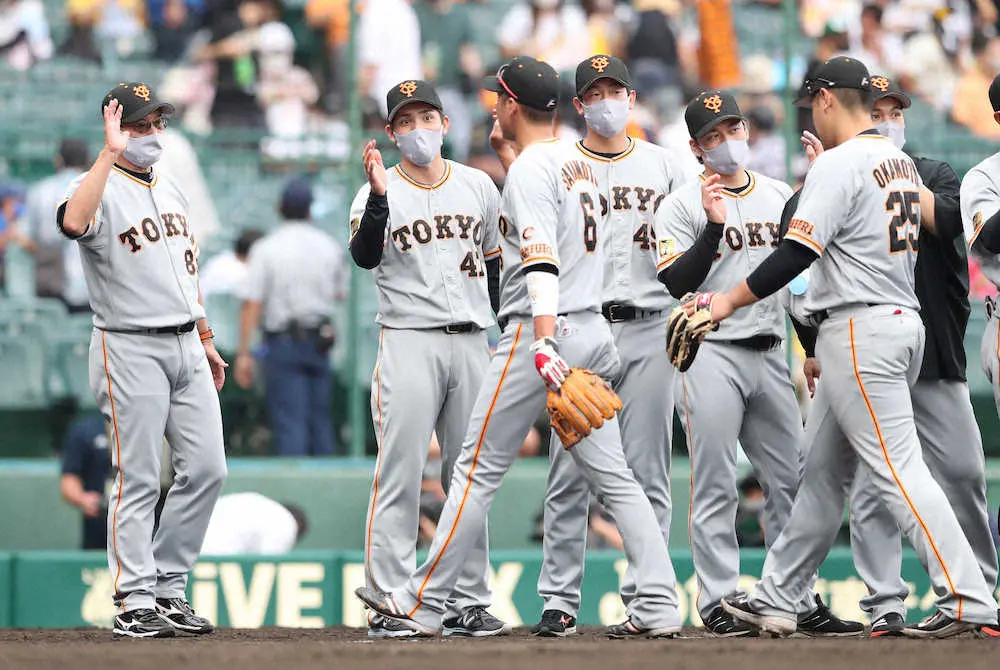 <神・巨12>阪神に勝利し、ナインを迎える原監督(左)と高橋(左から2人目)=撮影・平嶋 理子