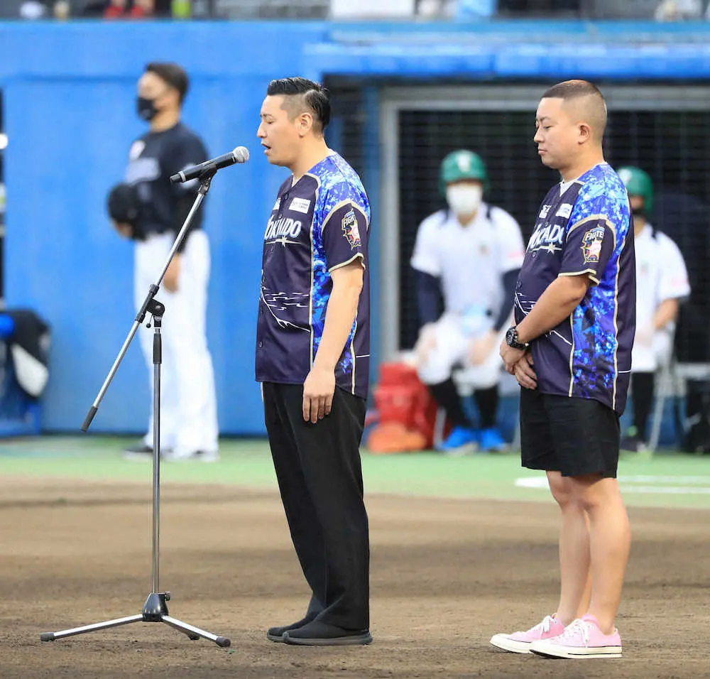 人気お笑いコンビ、チョコレートプラネットが日本ハム―ロッテ戦(静岡草薙)に先立ち、「君が代」を披露。人気曲「香水」のカバーでも話題になった見事な歌声に、スタンドから大きな拍手が送られた。