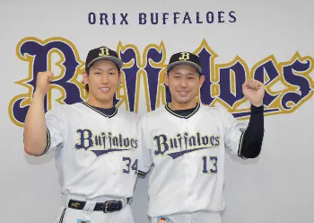 ファン投票で選出されたオリックス・吉田正尚(左)と宮城大弥は笑顔でガッツポーズ (代表撮影)