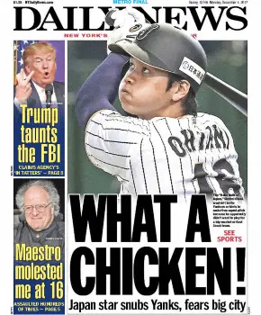 ニューヨークの地元紙も脱帽だ。17年12月のメジャー移籍の際に大谷がヤンキースを選ばなかったことに「なんてチキン(臆病者)」と辛らつな見出しをつけたデーリー・ニュースは、29日付のスポーツ面トップでエンゼルスの大谷の写真を掲載。