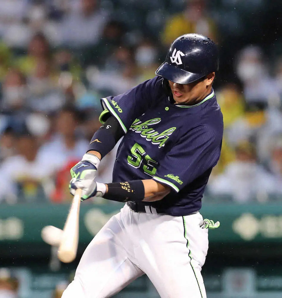 1回の第1打席は全球直球勝負で空振り三振を喫していたが、2打席目で4番の対応力を見せ、リーグトップで並んでいた巨人・岡本にこの時点で再び1本差を付けた。