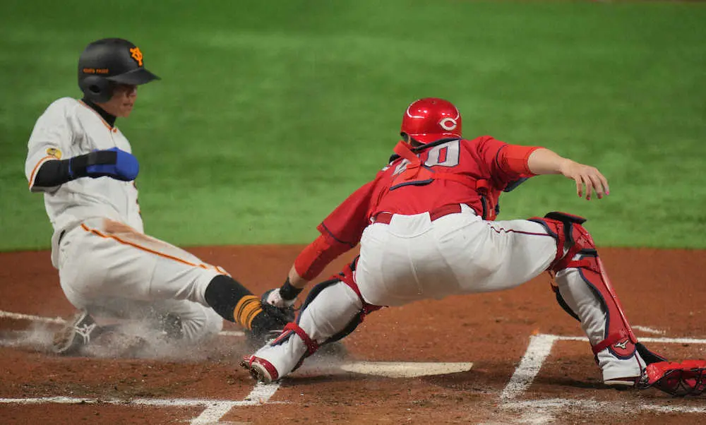 快投の山口を援護したい打線だったが、広島先発・九里の前に走者を出すもののホームが遠い。初回に先頭の松原が遊撃内野安打、続くウィーラーも三塁内野安打で出塁し無死一、二塁の好機。復帰後9戦連続安打中と好調の丸が二塁併殺打も2戦連発中の岡本和は四球で2死一、三塁とした。すると坂本の5球目に、一走の岡本和が二盗。捕手の磯村の送球の間に三走の松原が本塁を狙った。判定はセーフだったが、リクエストで判定が覆り先制とはならなかった。