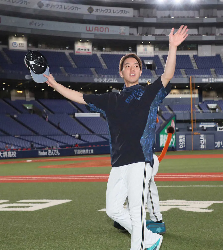 <オ・ロ>スタンドのファンに応えるオリックス・田嶋(撮影・後藤正志)