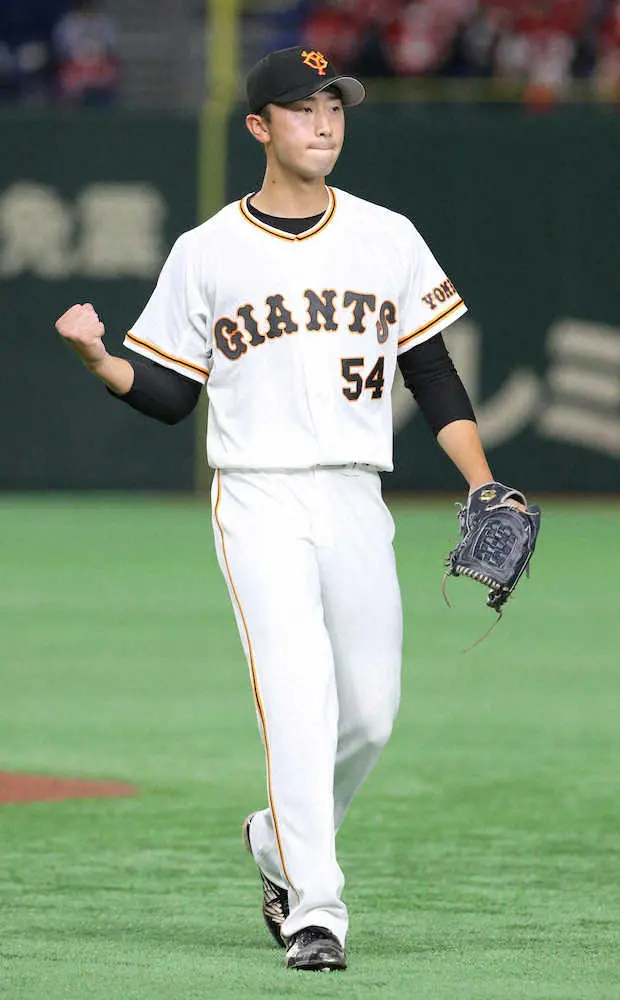 <巨・広>3イニングを無失点に抑え、プロ入り初セーブを挙げた直江はガッツポーズ(撮影・森沢 裕)