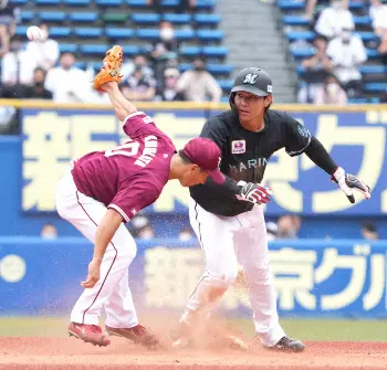 <ロ・楽>初回、1死一塁、中村奨の時に一塁走者・藤原は二塁盗塁に成功する(撮影・西川 祐介) Photo by スポニチ 足攻!忍者だ ロッテ・藤原、昇格即初回初球安打→二盗→先制ホーム ギャラリーで見る この記事のフォト 2021年07月04日の画像一覧 もっと見る 2021年07月04日の画像をもっと見る