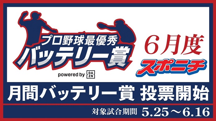 スポーツ動画配信サービスのDAZN(ダゾーン)は5日、プロ野球交流戦期間中を対象とした「月間最優秀バッテリー賞」候補者のセ・パ各3組、合計6バッテリーを発表した。本賞はDAZN公式ツイッター(@DAZN_JPN)上で行われるファン投票によって決定する。