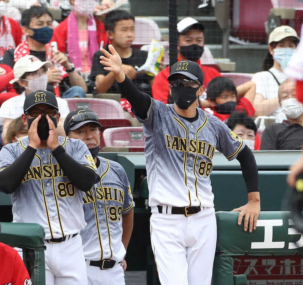 <広・神(10)> 4回2死二、三塁、矢野監督(右端)は秋山に代えて原口を代打に送る(撮影・大森 寛明)