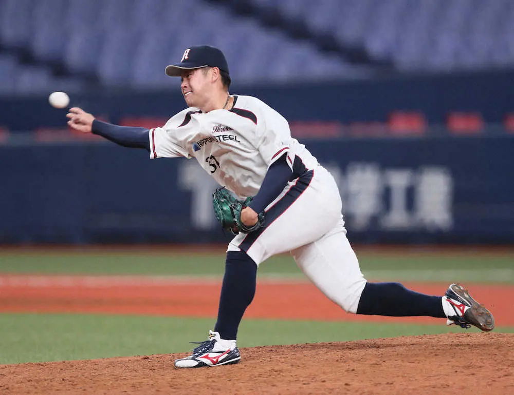 日本製鉄広畑 右横手から最速156キロ右腕の前川哲 3者連続三振で1回2/3を無失点