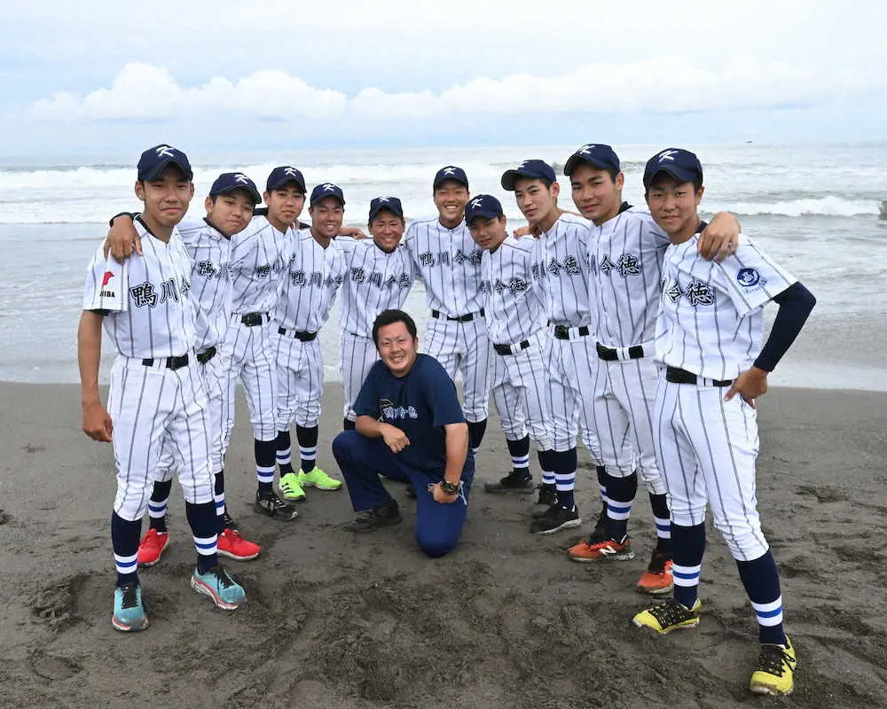 ランメニューを行う海岸で笑顔を見せるナインと松尾監督(前列中央) (撮影・柳内 遼平)