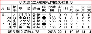 佐々岡監督からは「投げっぷりが彼のいいところ。球が生きていた」と認められ、後半戦も先発で起用される見込みだ。「まだそこ(完投ができる)までの力はない。今日みたいにみんなで0点に抑えられたらいい」。高卒2年目左腕の玉村も台頭中。確かな手応えを得て、反攻を期す後半戦に向かう。(河合 洋介)