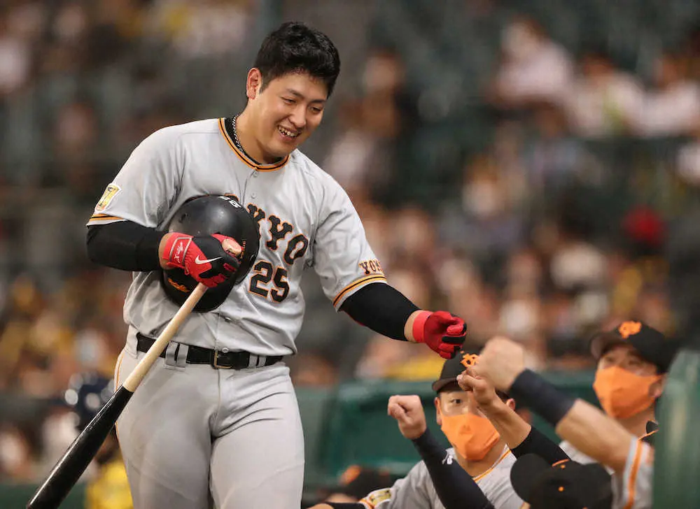 <神・巨>5回無死、左越え本塁打を放ち、笑顔の岡本和(撮影・平嶋 理子)