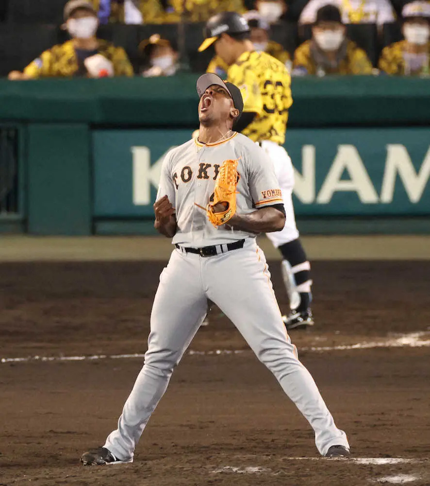 ビエイラは1―0とリードした9回、3番手としてマウンドへ。先頭のロハス・ジュニアをスライダーで空振り三振に仕留めると、続く近本は外角低め159キロのストレートで三邪飛に打ち取り、6球で2アウト。最後は糸原をこの日最速となった162キロのストレートで空振り三振に仕留めると、天を見上げて雄たけび。