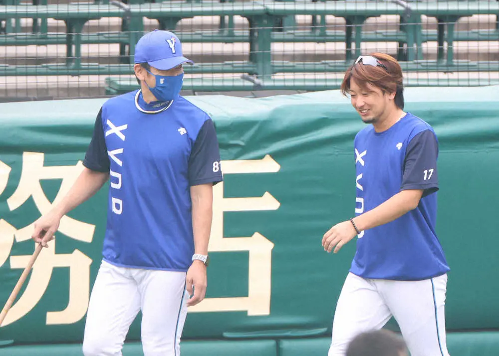 <神・D>三嶋(右)に声をかける三浦監督 (撮影・平嶋 理子)