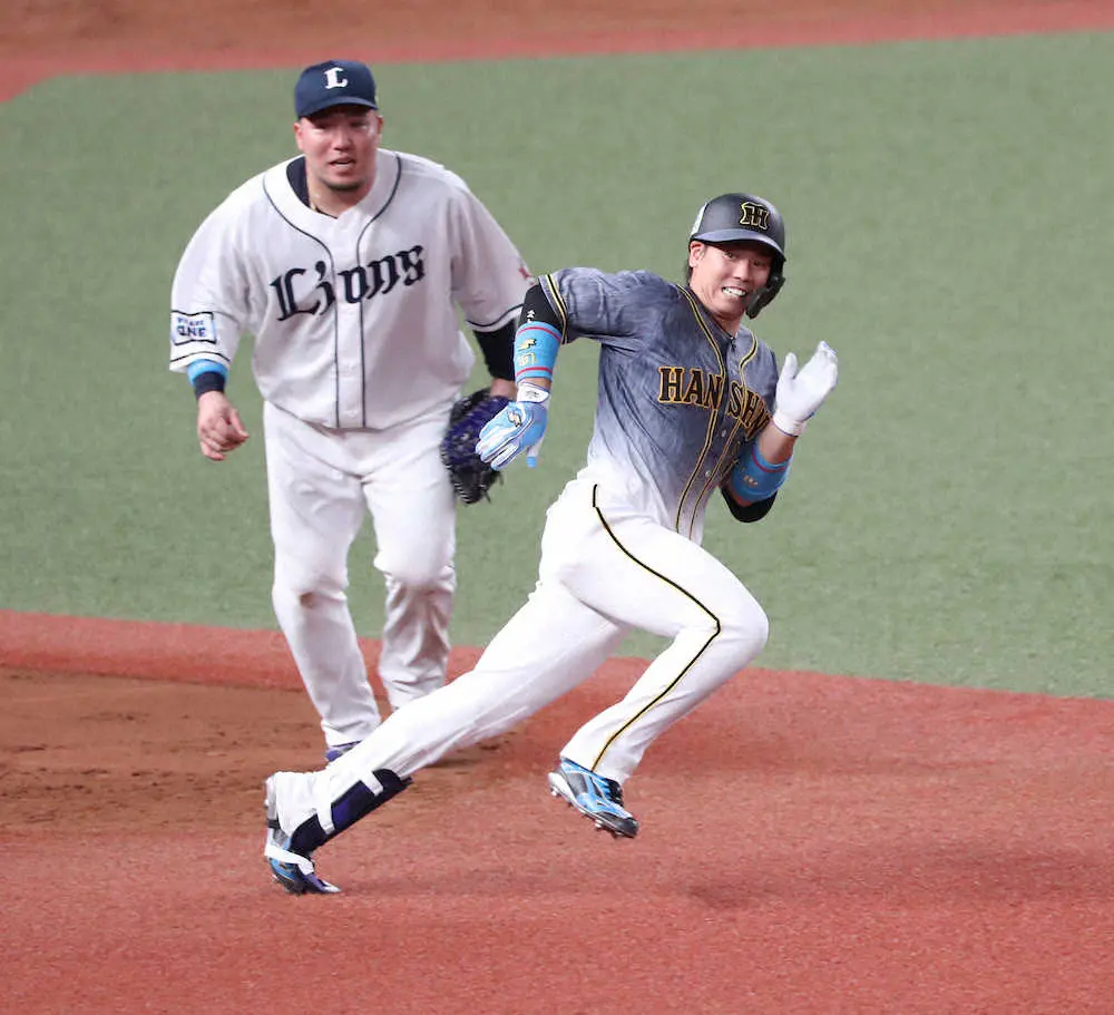 <全パ・全セ1>5回無死一塁、右翼線適時三塁打を放つ梅野(左は山川)(撮影・岡田 丈靖)
