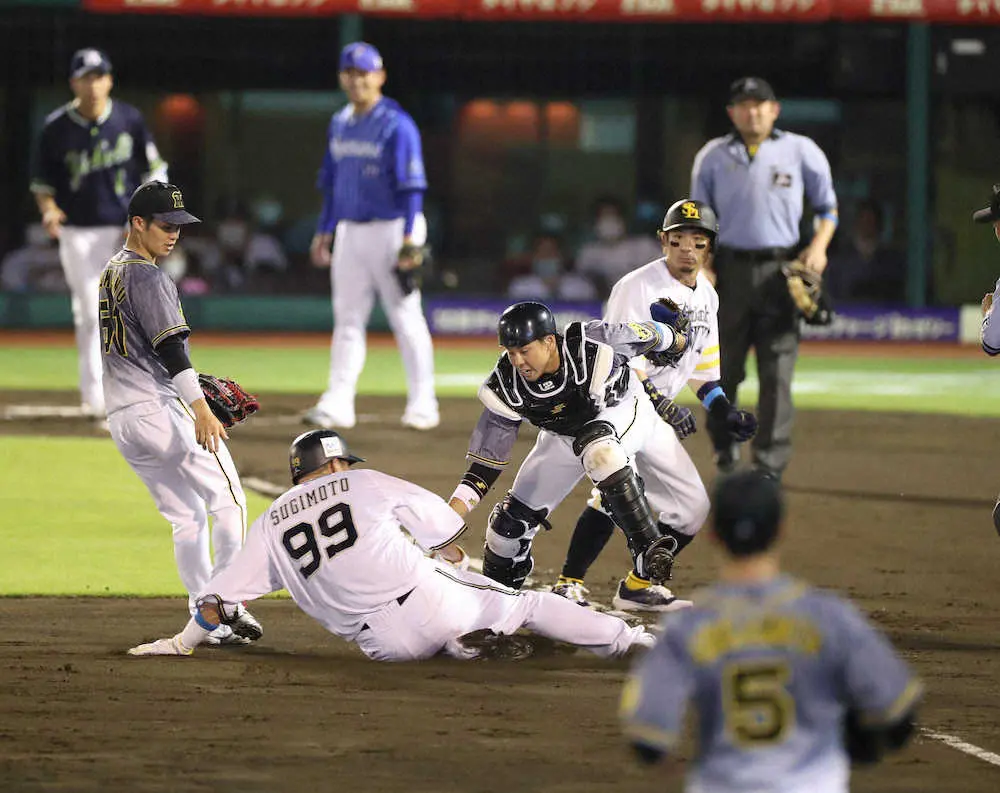 1―3の7回無死一、三塁。栗原の二ゴロで送球を受けて三塁走者・松田を三本間に挟んだ。三塁側へ追い込みつつ、一塁走者・杉本の動きも見逃さない。「追いながら、後ろのランナーが見えたので、これはいけると思った」。松田を帰塁寸前でタッチアウト。動きを止めることなく、三塁へ滑り込んできた杉本の体にも触れた。