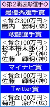 ≪楽天が史上初の“4部門独占”≫島内(楽)が決勝二塁打を含む3安打3打点でMVP。楽天選手の勝利打点とMVPは、ともに08年第1戦の山崎武司(サヨナラ打)以来13年ぶり2人目だ。また、楽天打者の猛打賞は島内が初で、ゲーム3打点は05年第1戦の礒部公一、07年第2戦の山崎の各2打点を抜く最多になった。なお、この日は勝利投手が宋家豪、セーブが松井の楽天勢。球宴で勝利投手、セーブ、勝利打点を本拠地球団の選手で占めたのは、75年第1戦の甲子園で阪神勢の江夏豊が勝利、安仁屋宗八がセーブ、藤田平がV打を記録して以来46年ぶり2度目だが、この時のMVPは山本浩二(広)。MVPを含む4部門独占は楽天が初めてだ。
