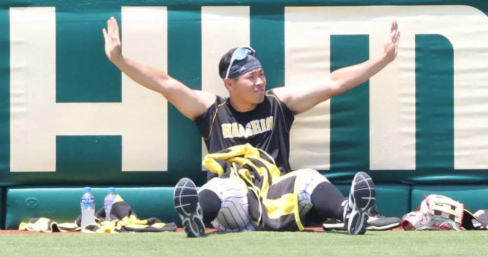 <阪神練習>練習を終え、リラックスムードの佐藤輝(撮影・成瀬 徹)