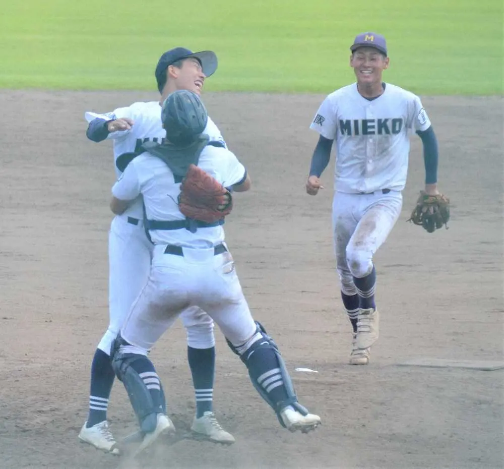 1点差の9回、ピンチをしのいで勝利し抱擁する三重高の谷、服部バッテリー