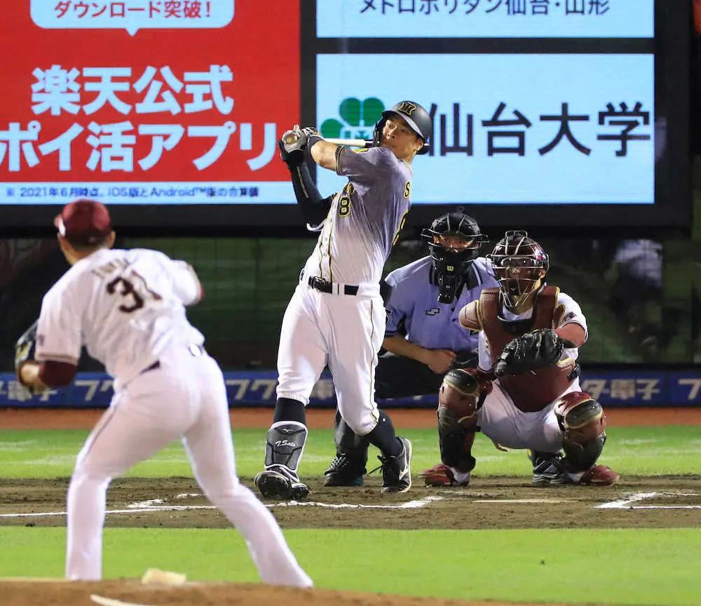 2回先頭で則本昂と対峙(たいじ)した第1打席は外角高めへの150キロをジャストミートしたが、打球はジャンプした二塁手・黒川のグラブに収まった。相手の好捕に阻まれたとはいえ、確かな快音を発すると、6回2死走者なしの第3打席だった。マウンドに上がったばかりの2番手・福井の初球、内角に浮いた145キロをしっかりと仕留め右翼線二塁打とした。7月31日西武戦で本塁打して以来、6試合21打席ぶりの長打。交流戦、オールスター第2戦に続いて父方の祖父母がスタンドで見守る前で、豪快な打撃を披露した。