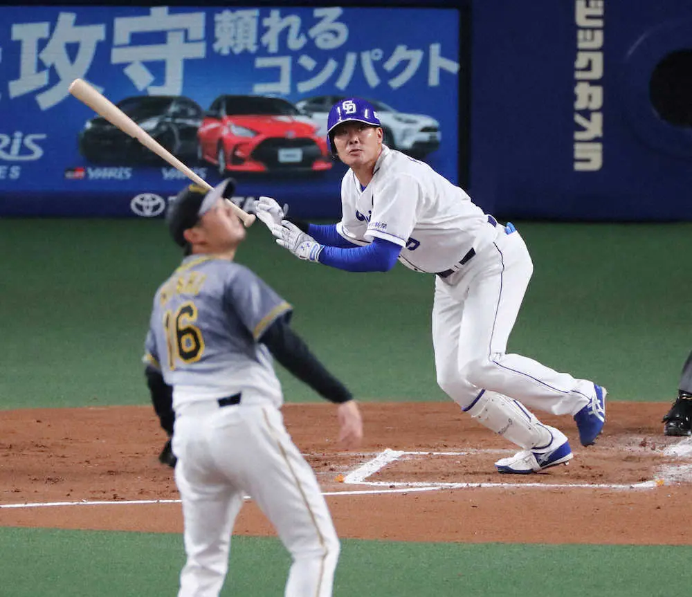 0―0の2回、先頭で西勇のシュートを振り抜くと、打球は左中間フェンスを直撃。二塁打でいきなりチャンスをつくった。堂上が敵失でつないで無死一、三塁と好機を広げると、木下拓が中前に先制打。三塁走者の福留が先制のホームを踏んだ。