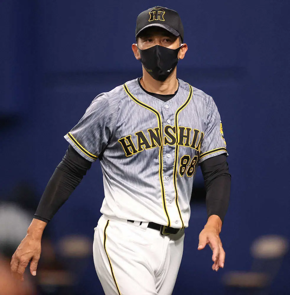 <中・神(12)>4回、選手交代を告げてベンチに戻る矢野監督(撮影・北條 貴史)