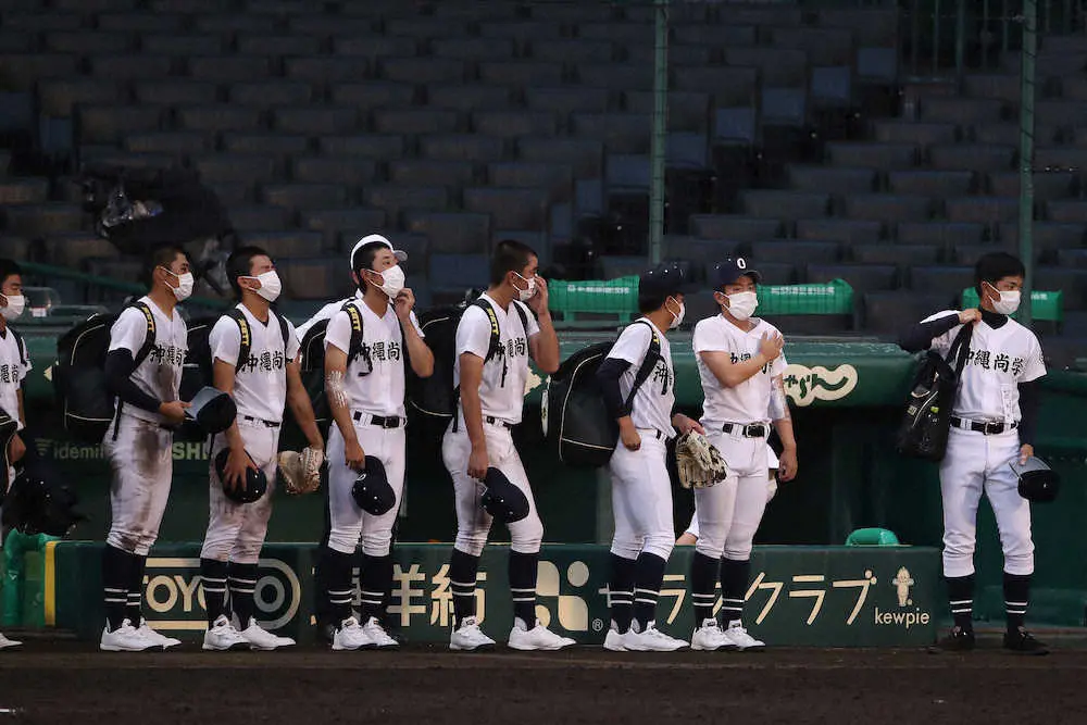 <盛岡大付・沖縄尚学>盛岡大付に敗れ、肩を落とす当山(右から2人目)ら沖縄尚学ナイン(撮影・河野 光希)