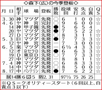 広島・森下の今季登板 Photo by スポニチ 広島・森下 24日G戦先発「QSよりチームの勝利」前回敗戦のリベンジだ!!中… ギャラリーで見る この記事のフォト 2021年08月24日の画像一覧 もっと見る 2021年08月24日の画像をもっと見る