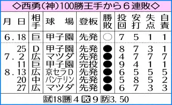 阪神・西勇はまたも通算100勝に届かなかった。6度目の挑戦は6回3失点の粘投の末に9敗目。後半戦では初めてクオリティー・スタート(6回以上、自責点3以下)を達成しても実らなかった。