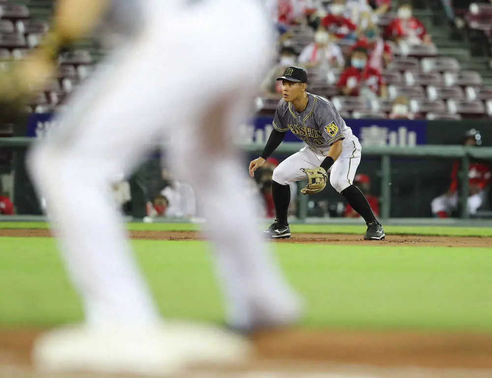 <広・神(15)> 三塁の守備に就く阪神・佐藤輝(撮影・大森 寛明)