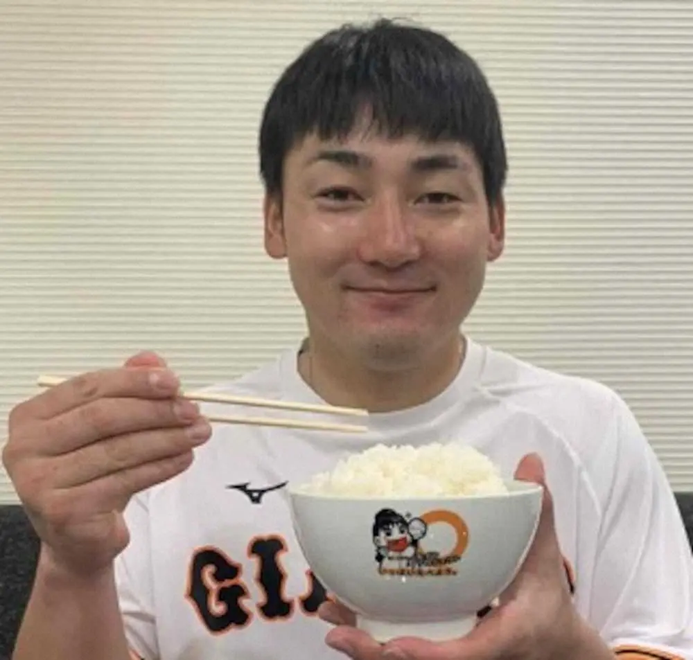 山盛りご飯を手にする丸(球団提供)