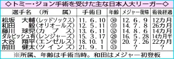 ▽肘じん帯再建手術 損傷した肘のじん帯(内側側副じん帯)を切除し、他の部位から正常な腱を移植する手術。従来の手法なら投手では復帰に1年以上かかる。1970年代に故フランク・ジョーブ博士が考案し、ドジャースの投手だったトミー・ジョンが74年に初めて受けたことにちなみ「トミー・ジョン手術」とも呼ばれる。日本球界では村田兆治(元ロッテ)が最初に受け、以降、桑田真澄(元巨人)、ダルビッシュ有(パドレス)、大谷翔平(エンゼルス)ら、多くの投手が経験した。
