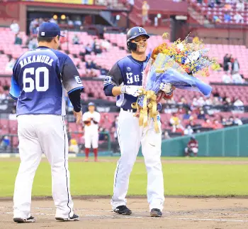 しかし9回の第4打席、投手が4番手・牧田との対戦となると、ついに大記録達成。4球目、外角へのカーブを逆らわず逆方向へ弾き返し左前打。一塁ベース付近でチームメートの中村、元チームメートの楽天捕手・炭谷から花束が贈られ笑顔。大歓声のなか代走が送られベンチへと戻ると仲間からも手厚い祝福を受けた。