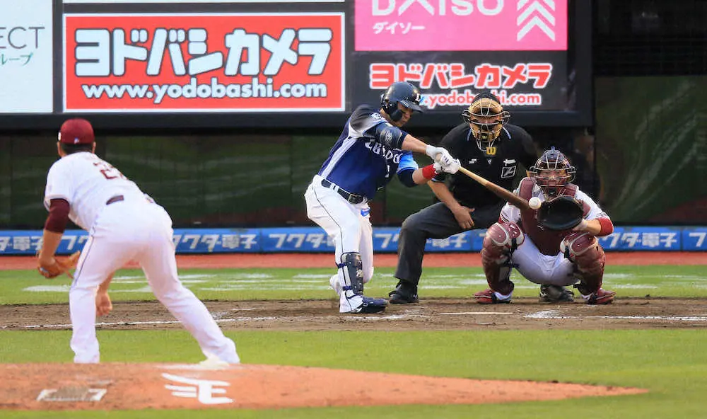 <楽・西>9回1死、左前打を放つ栗山。通算2000安打を達成する(撮影・尾崎 有希)