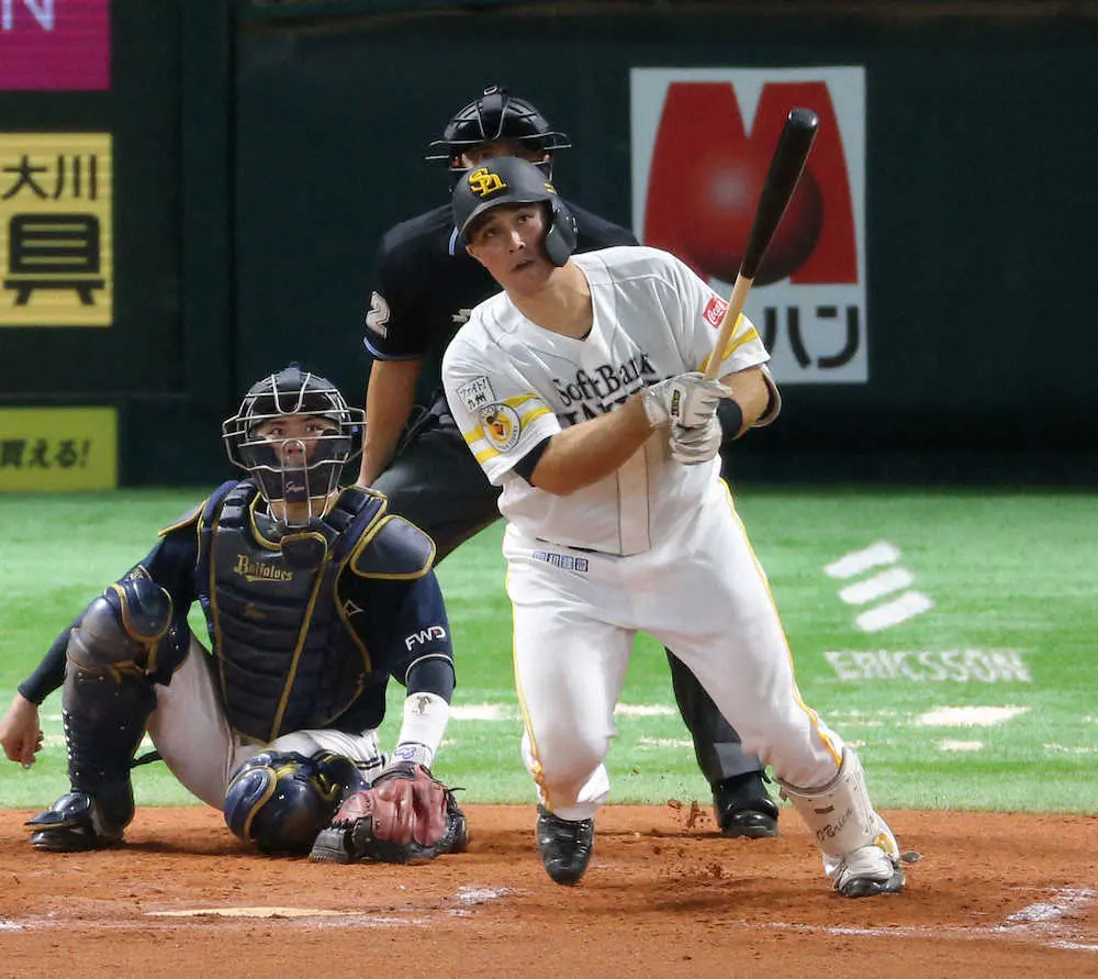7回の第4打席。オリックス・張の153キロ直球をはじき返し、中前に運んだ。待望の一打にベンチで喜ぶナインにガッポーズ。三塁の守備に向かうと、本拠地の鷹党から大きな拍手が送られ、照れくさそうにお辞儀した。
