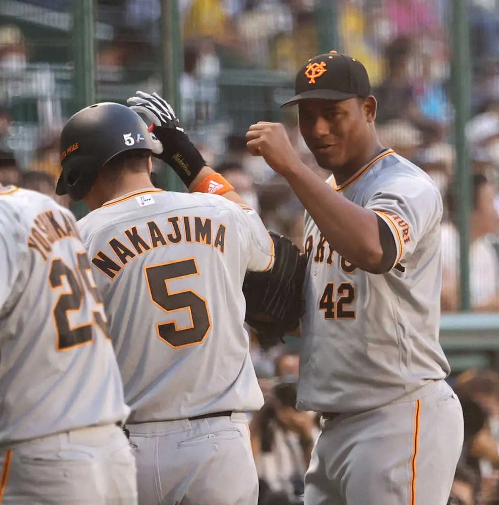 <神・巨>初回2死二塁、2点本塁打を放ち生還する中島を迎えるメルセデス(撮影・後藤 正志)
