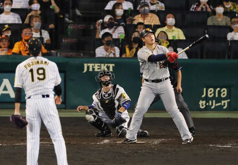 <神・巨>5回1死一、二塁、岡本和は左越えに35号3ランを放つ(投手・藤浪)(撮影・大森 寛明)