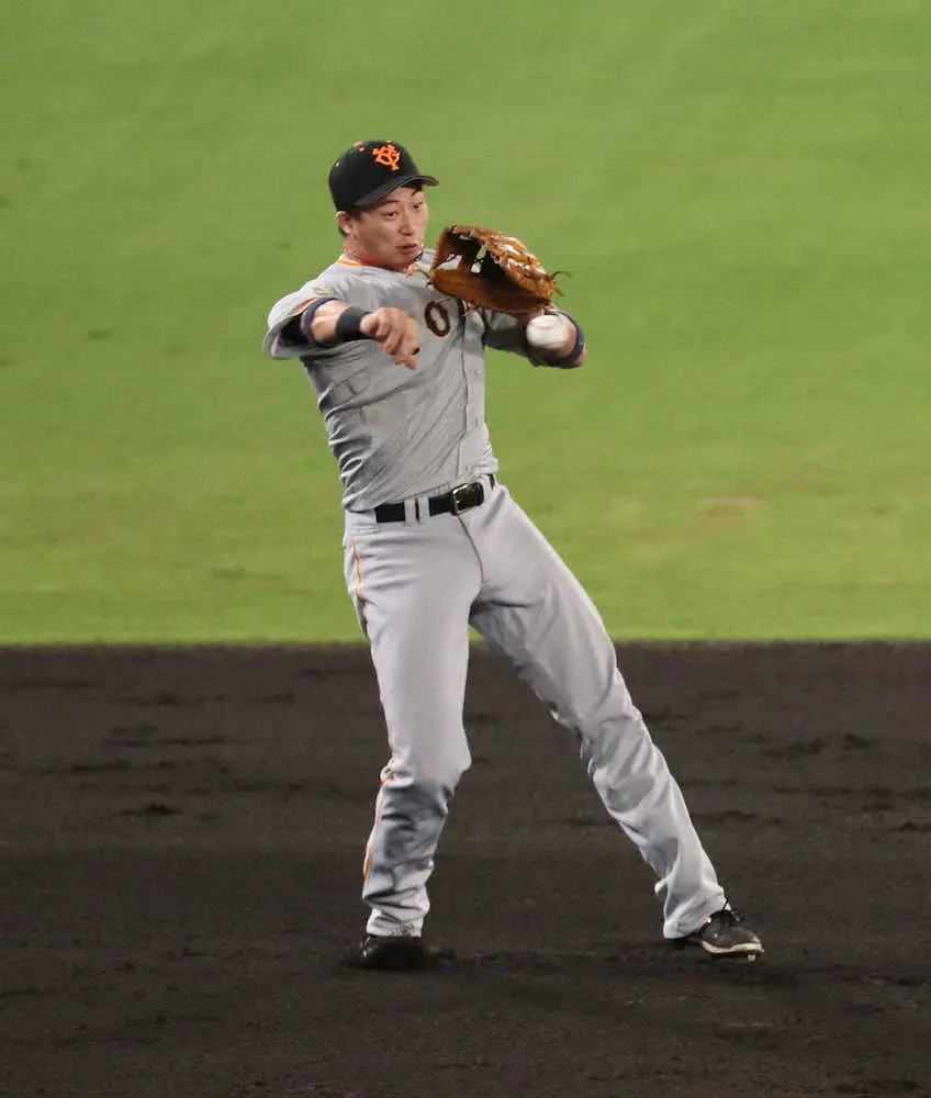 <神・巨>7回無死一塁、マルテの打球を捕球し送球するも二塁悪送球となり進塁を許す広岡(撮影・後藤 正志)
